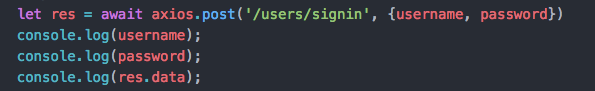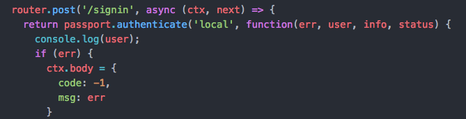 老师我在做注册的时候提交给sigin接口的时候验证错误,是用户名不存在。肯定是create了,可以在可视化工具里看见。 这是注册给登陆接口的打印,用户名密码都没问题。 然后在登陆口打印的user是false 然后我就去passport那里看,也能得到username 这个分别是passport的username。user是false。然后注册接口 代码是没问题,我仔细检测了好多遍,不确定的我复制您的代码结果也是这样
