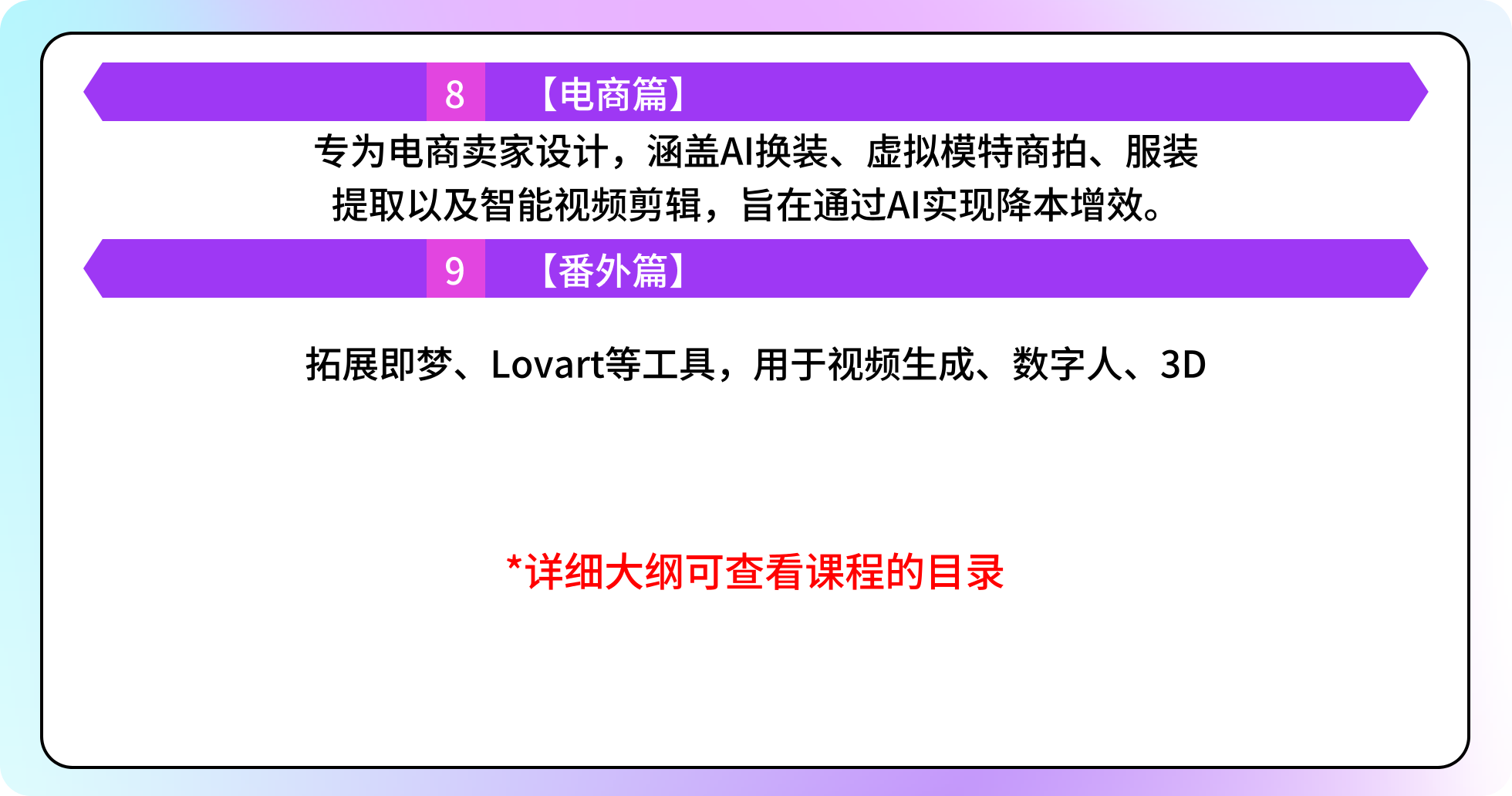 本章专注于AI在电商和影视领域的创意应用,涵盖AI换装工具的高效使用、AI模特穿搭秀的免费应用、AI自动换模特与背景生成系列套图、创意生图的关键要素(主体、穿着、环境与构图)、电商必备的平铺3D、去水印、服装提取解决方案,以及AI商拍视频的多种功能,包括图生视频、视频复刻、多图成片和搭配成片。此外,还介绍了智能混剪与模特替换功能,帮助AI小白快速制作爆款短视频,以及AI生成影视拍摄现场的案例。通过这些内容,用户将掌握如何利用Midjourney提升电商和影视创作的效率和创意水平。