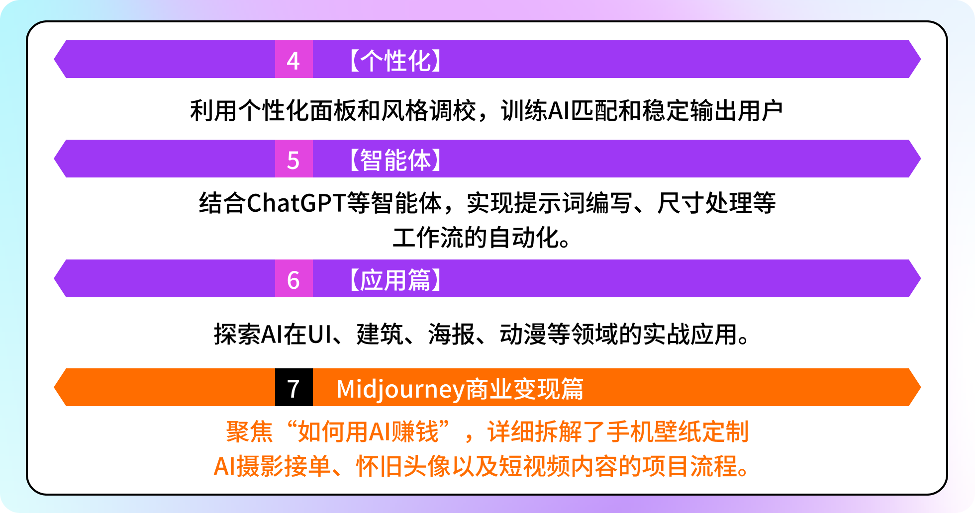 本章主要介绍智能体在Midjourney创作中的高效应用。内容包括智能体生成提示词的高效方法、批量生成不同尺寸图像的操作技巧、智能体实现即时风格切换的功能、利用ChatGPT设计智能体批量制作四格漫画的案例、智能体的中英双语提示词升级,以及风格一致性的优化与定制场景的灵活应用。通过这些内容,用户将能够借助智能体大幅提升创作效率和效果。