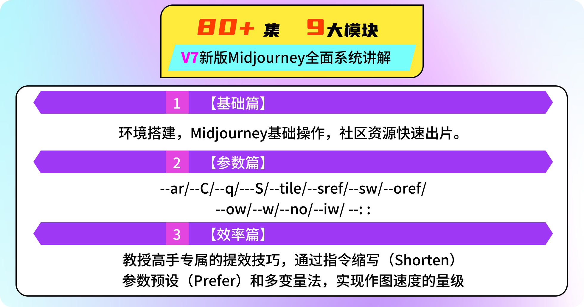 本章主要讲解如何通过优化提示词和参数设置提升Midjourney的使用效率。内容包括如何高效提取和优化提示词、使用Shorten简化提示词、灵活切换默认参数、通过Prefer参数实现高效出图、利用repeat功能提升效率,以及单变量和多变量法的快速作图技巧。