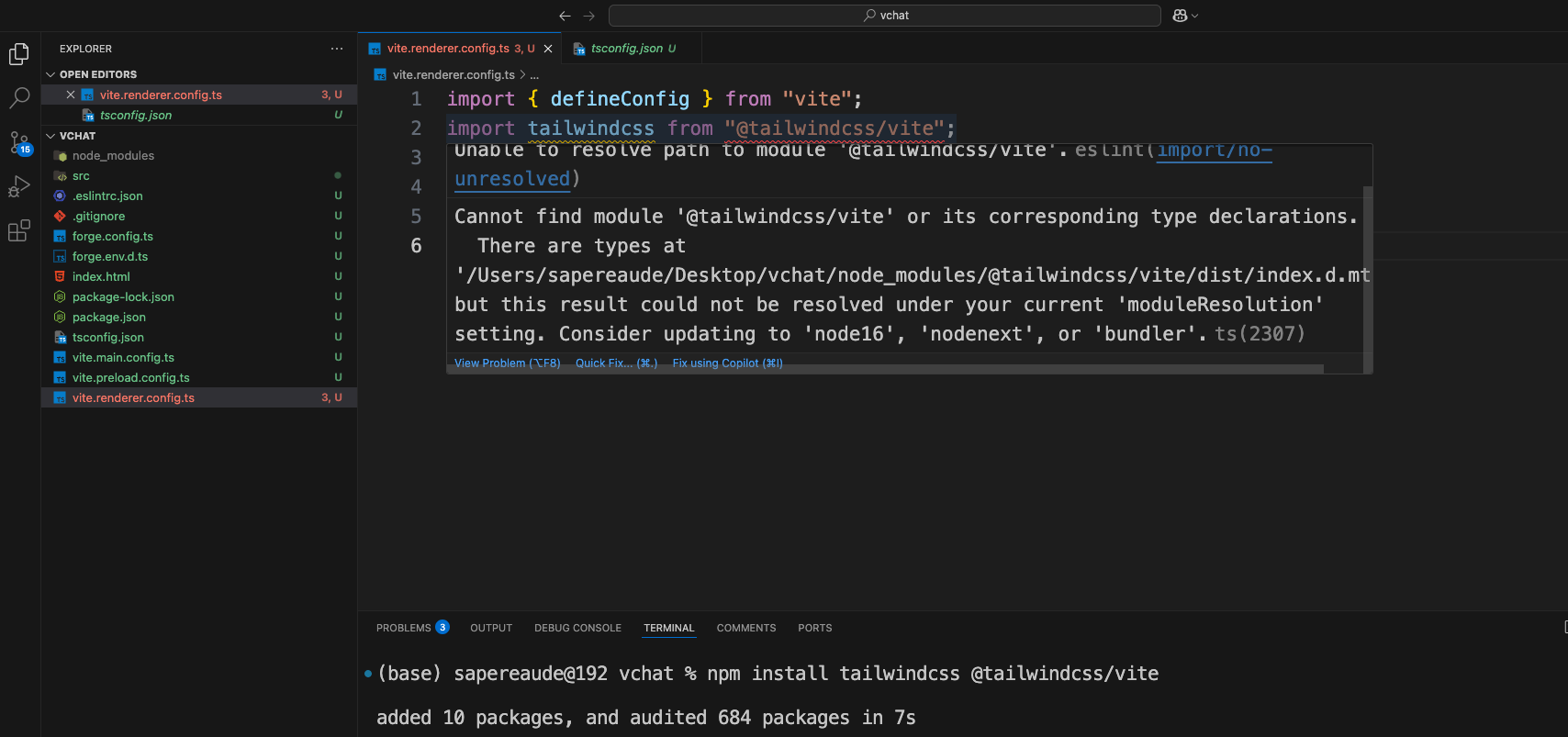 【Cannot find module '@tailwindcss/vite' or its corresponding type declarations. There are types at '/Users/sapereaude/Desktop/vchat/node_modules/@tailwindcss/vite/dist/index.d.mts', but this result could not be resolved under your current 'moduleResolution' setting. Consider updating to 'node16', 'nodenext', or 'bundler'.ts(2307) Unable to resolve path to module '@tailwindcss/vite'.eslintimport/no-unresolved)】,