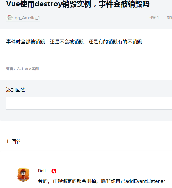 我看dell老师回答一个学生说的是事件会被销毁但是我用老师的例子销毁vue实例后点击提交按钮alert('---');还是可以成功的是不是可以说明没有销毁事件