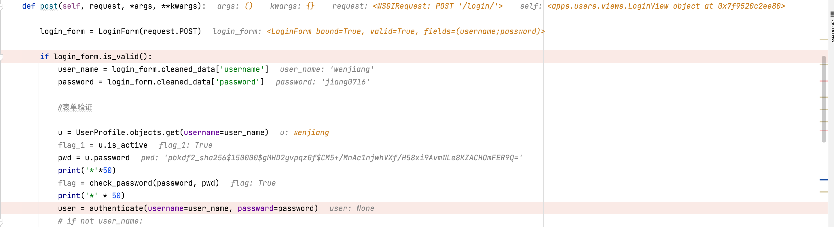 用Check_password 对POST到的username, password和UserProfile中的进行了比对,发现手动可以找到user, 但是authenticate就是返回None(), 怎么解决这个问题 很头疼!!!